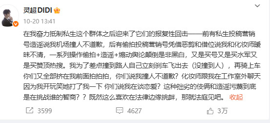 10月,灵超曾喊话私生粉法庭见,称被私生粉袭击性抗击,包括偷拍、责怪、挑动公论倒置短长是曲等。