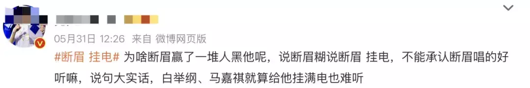 道理的是,还有粉丝认为断眉挂电是网友在黑他,便是忌妒断眉唱得好,就算挂电了,那还得是东谈主家断眉有基础底细,若是给别的歌手挂电,该从邡照样从邡。