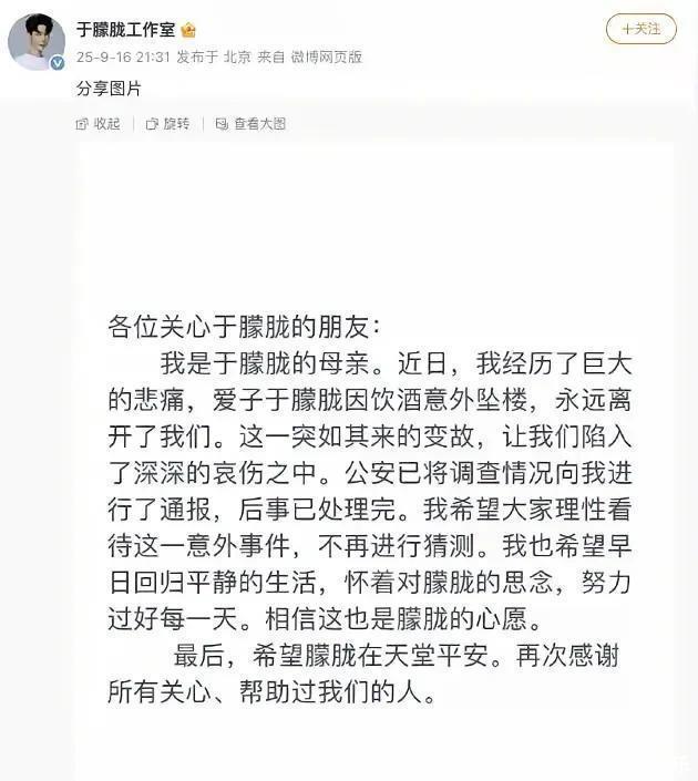 2025年9月16日,一则令东谈主心碎的声明通过演员于暧昧母亲的官方责任室微博发布体育游戏app平台,老成对外公开了其子因饮酒后不测坠楼身一火的恶耗。这一讯息不仅惶恐了文娱圈,也让遍及粉丝堕入悲痛。尽奇迹件发生于9月11日,但家属遴荐在五天后才对外公布,这一决定背后所体现出的松弛与克制,正是公众公论惩办与私东谈主吊祭之间奥密均衡的缩影。