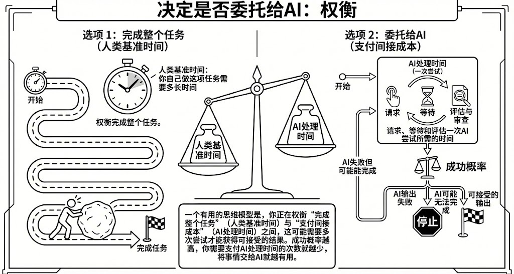 一个实用的念念考模子不错这样:你是在“落寞完成通盘任务”(东说念主类基准期间)与“支付管制支拨”(AI 处理期间)之间进行量度。你可能需要支付屡次支拨,直到得到怡悦的截至。得胜概率越高,你支付 AI 处理期间的次数就越少,将任务交给 AI 的性价比就越高。举个例子,假定一项任务你我方作念需要一小时,AI 几分钟就能作念完,但检讨谜底需要三十分钟。在这种情况下,惟有在得胜概率极高时才应该交给 AI,不然你花在生成和检讨草稿上的期间比你我方发轫还要多。干系词,如果东说念主类基准期间是 10 小时,那么即使要花几个小时和 AI 磨合亦然值得的,前提是 AI 最终能胜任这份使命。