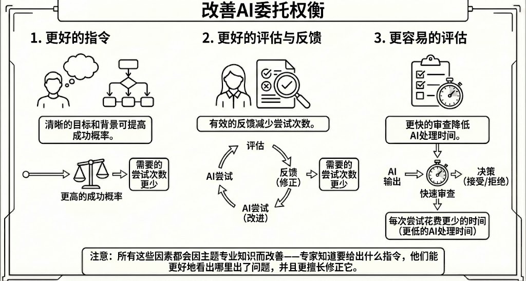 为了让向 AI 寄托使命更合算,咱们不错通过三件事来提高得胜概率并缩短 AI 处理期间。开拔点,咱们不错提供更好的指示,设定透露的策划,让 AI 有更高的扩充得胜率。其次,咱们不错提高评估和反应的效力,从而减少让 AI 步入正轨所需的尝试次数。终末,咱们不错简化评估过程,用更少的期间判断 AI 的发扬优劣。所有这些身分王人依赖于专科范畴学问——群众知说念该下达什么样的指示,能更热烈地发现问题,并能更有用地更动乖张。