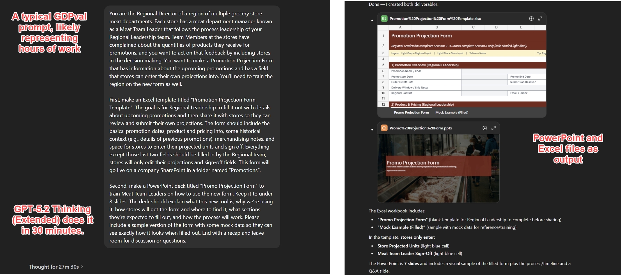 咱们知说念这个方程式是胜仗的,因为旧年夏天,OpenAI 发布了对于 AI 与推行使命最进攻的一篇论文——GDPval。我之前研究过这篇论文,其中枢在于让金融、医学、政务等不同范畴的资深东说念主类群众与最新的 AI 进行对决,并由另一组群众担任评委。群众平均需要 7 小时完成任务,因此在这种情况下,这即是“东说念主类基准期间”。而 AI 处理期间很故真理:AI 完成任务只需几分钟,但群众推行检讨使命需要一小时,天然,编写教唆词也要花期间。至于“得胜概率”,在 GDPval 当先发布时,评委大多判定东说念主类胜出,但跟着 GPT-5.2 的发布,天平发生了歪斜。GPT-5.2 Thinking 和 Pro 模子平均有 72% 的次数与东说念主类群众握平或将其打败。