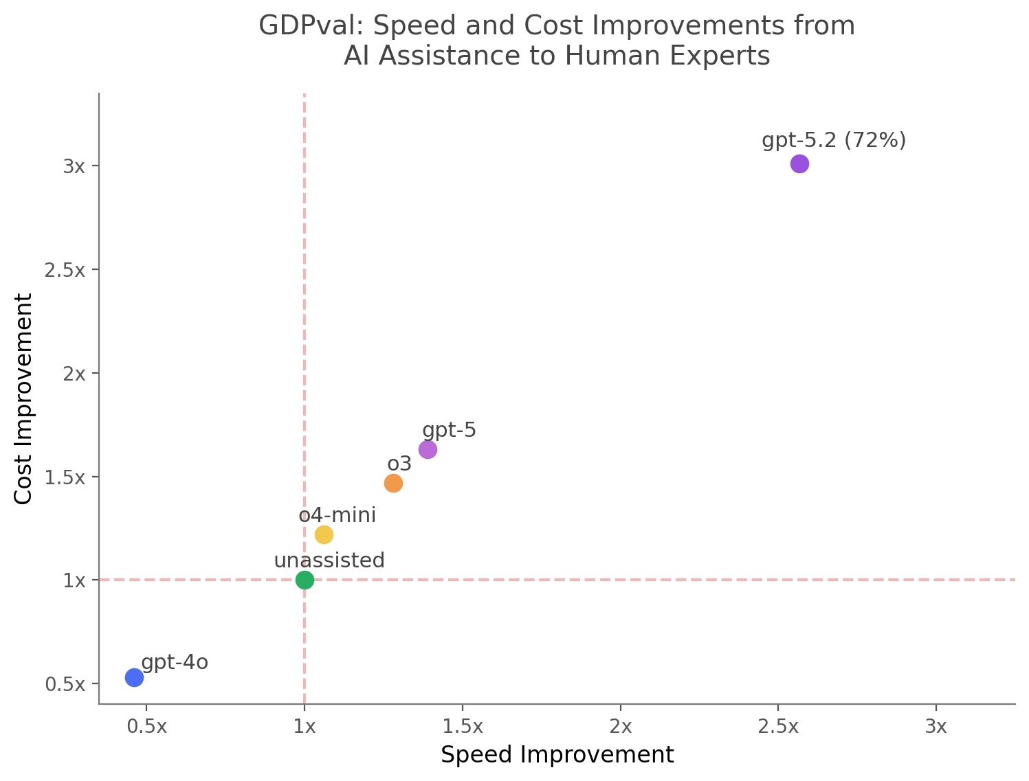 在“草稿 → 审核 → 必要时重试”的使命流下,AI 赞成完成 GDPval 任务带来的速率和老本进步(相对于未受赞成群众的 1x 基准)。GPT-5.2 的数据点是基于其在 GDPval 中约 72% 的胜平率进行的推测;其他模子的数据点来自 GDPval 论文。现实寰宇的截至会因任务而异:有些任务是“松懈取胜”,有些是赫然失败,而最辣手的情况是那种“看起来没问题其实有错”的失败。