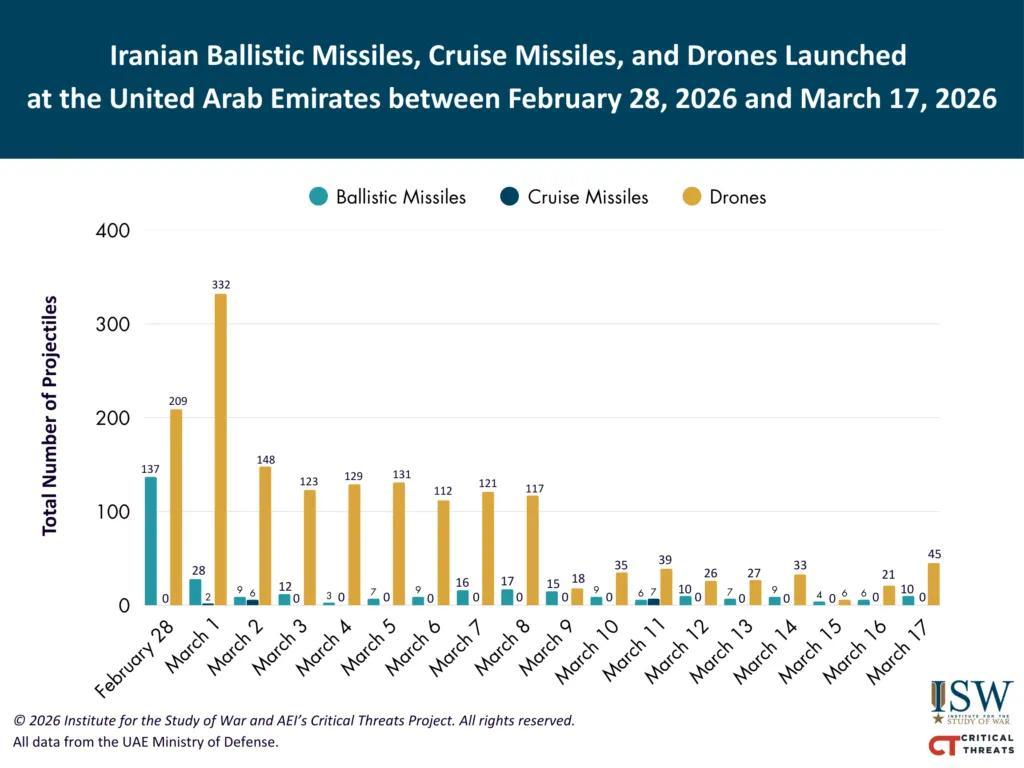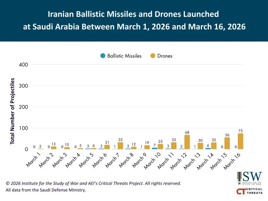 上图:2月28日至3月17日,可统计的伊朗逐日对阿联酋放射弹说念导弹(浅蓝)、巡航导弹(深蓝)及无东说念主机(橙)数目变化,下图:3月1日至16日可统计的伊朗对沙特放射弹说念导弹及无东说念主机数目变化 起头:好意思国智库干戈磋磨所ISW